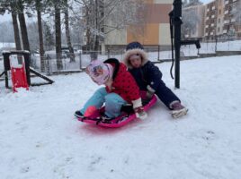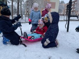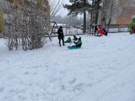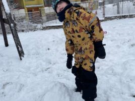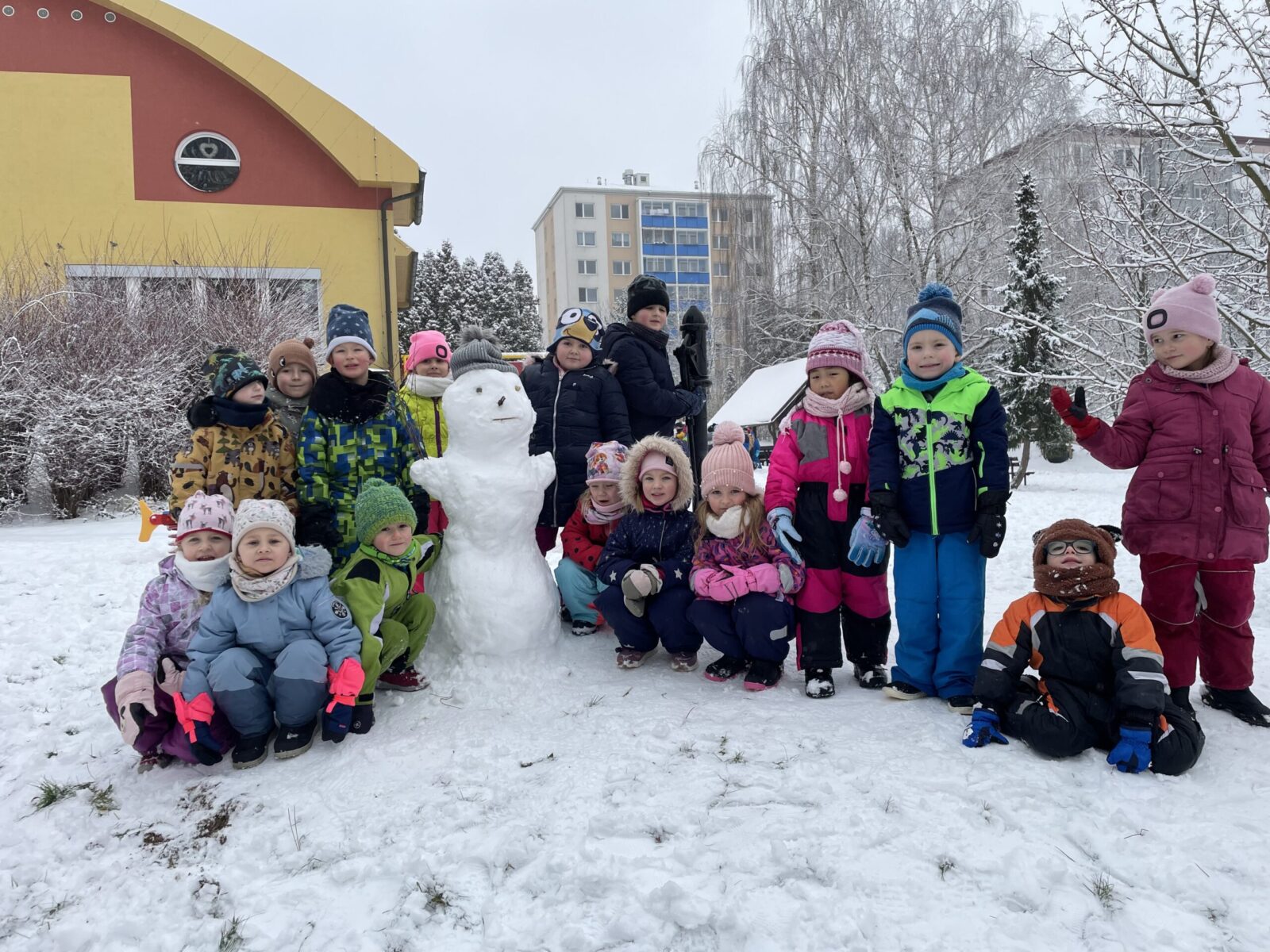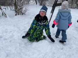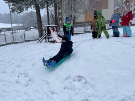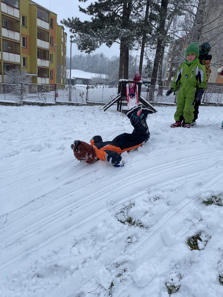 Stavění sněhuláka a bobování na zahradě